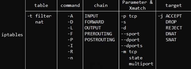 - <-j 动作="">:处理数据包的动作,包括ACCEPT、DROP、REJECT等-j>